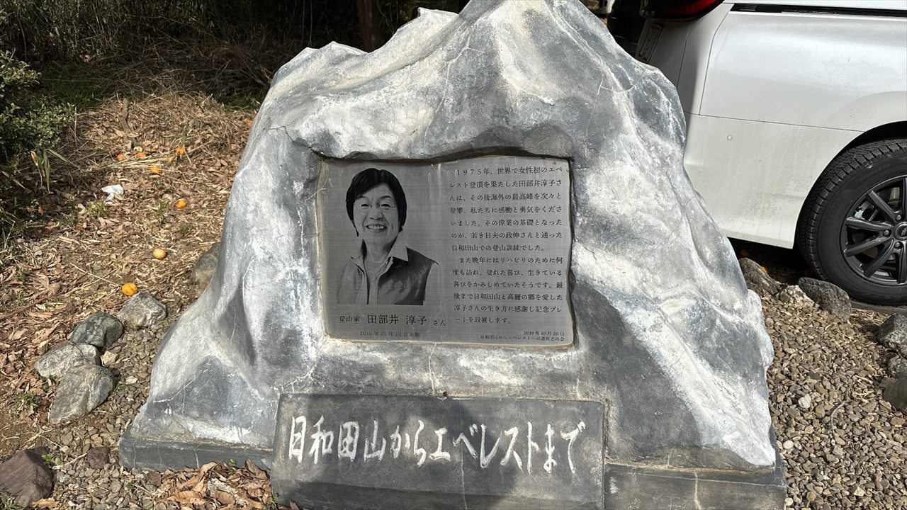「日和田山」登山道入口の少し先(高麗駅方面から来ると手前)に田部井淳子さんの「日和田山からエベレスト」の碑があります。田部井さんは日和田山の男坂の脇にある岩場のクライミング練習場に旦那さんと車で来て訓練していたそうです。