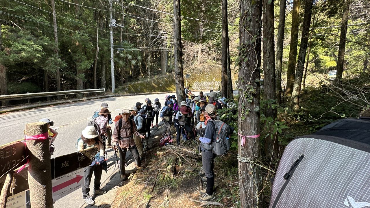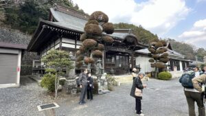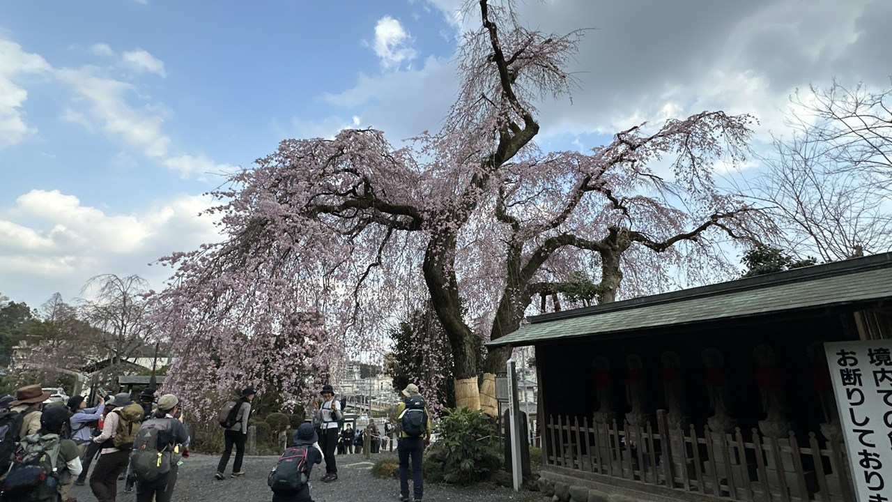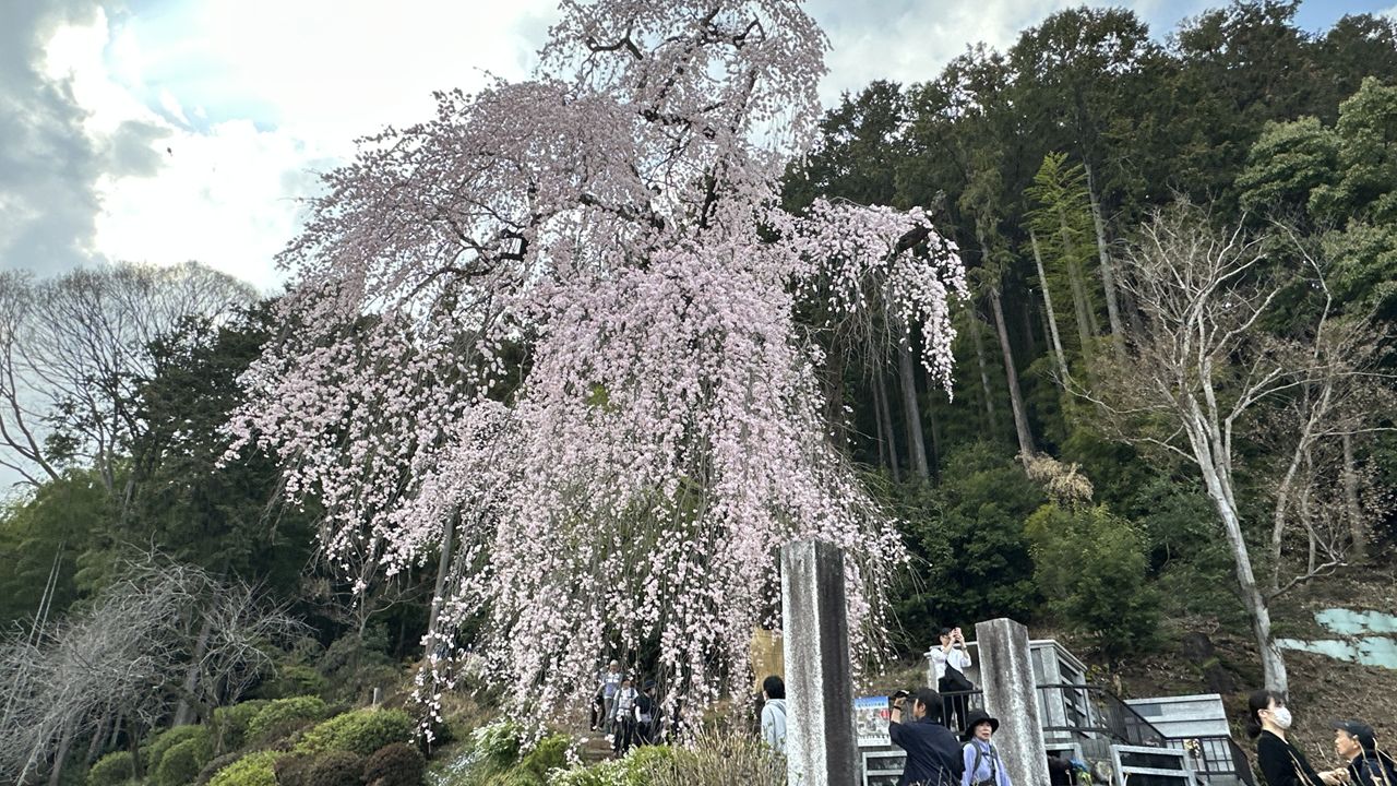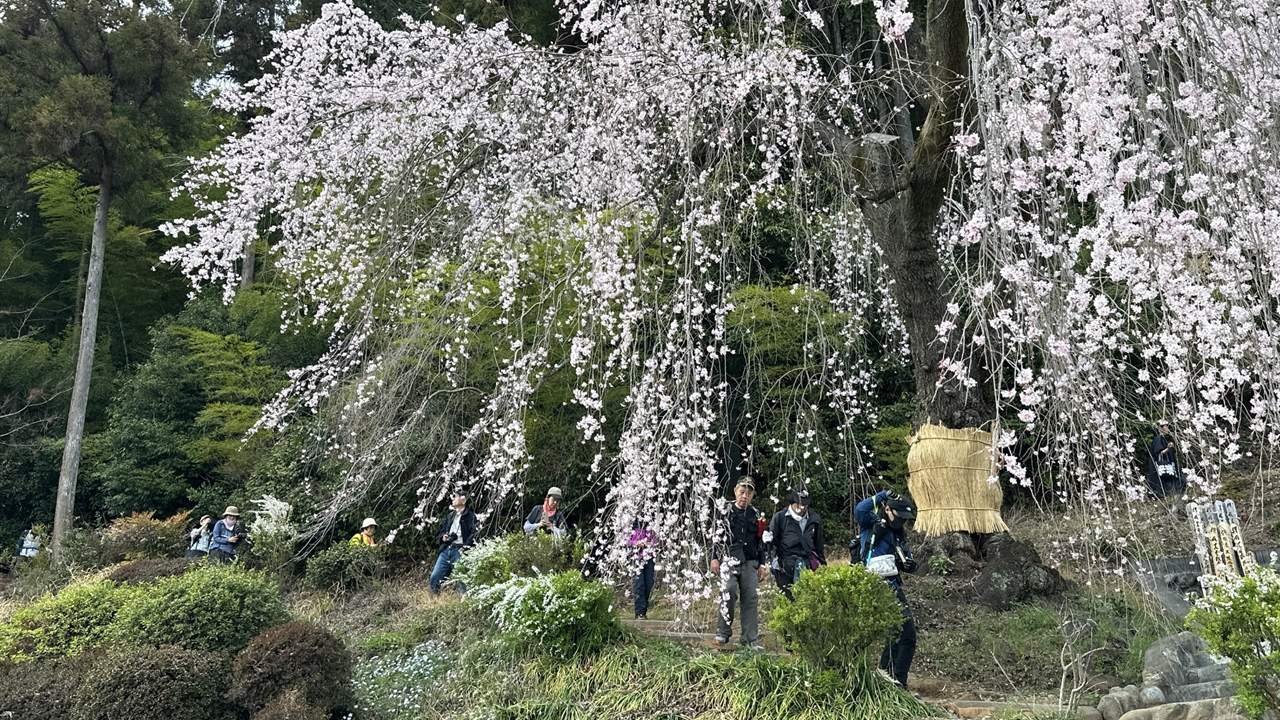 今回の目的のひとつに「梅岩寺」の「枝垂桜」を見るというのがありましたが、長い距離を歩いた後に、最後に「梅岩寺」に向かって下りたちょうど、下山口のところにみごとな「しだれ桜」が咲いていました。早速、その下で集合写真を撮って解散しました。(笑)